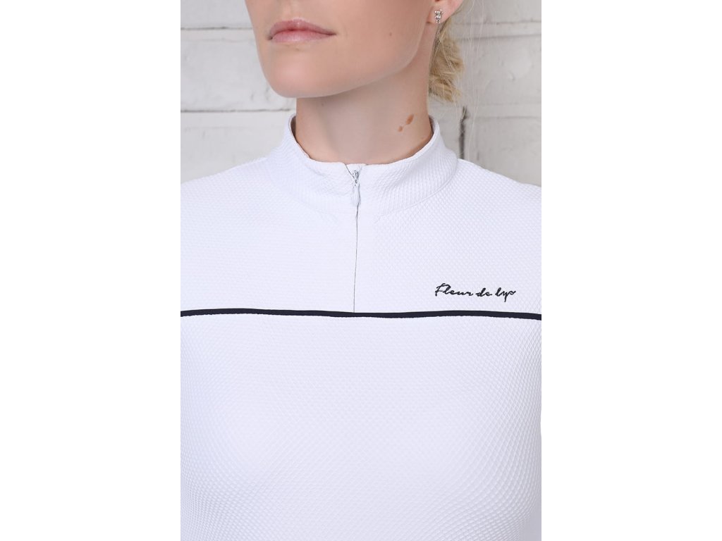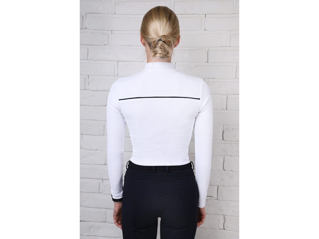 Equestro Ridertechnology collection women's slim fit long-sleeved training polo shirt in technical fabric with heat-sealed seams and windproof front zip.