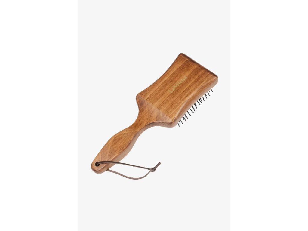 Dodajte starostlivosti o hrivu nádych prírodného luxusu s touto kefou na hrivu a chvost. Ergonomická drevená rukoväť a kožené pútko na zavesenie ju odlišujú, zatiaľ čo polstrované, vlnité štetiny sú ideálne na rozčesávanie hrivy a chvosta. Krásne reliéfne logo so zlatým textom dodáva kefe charakteristický vzhľad LeMieux.