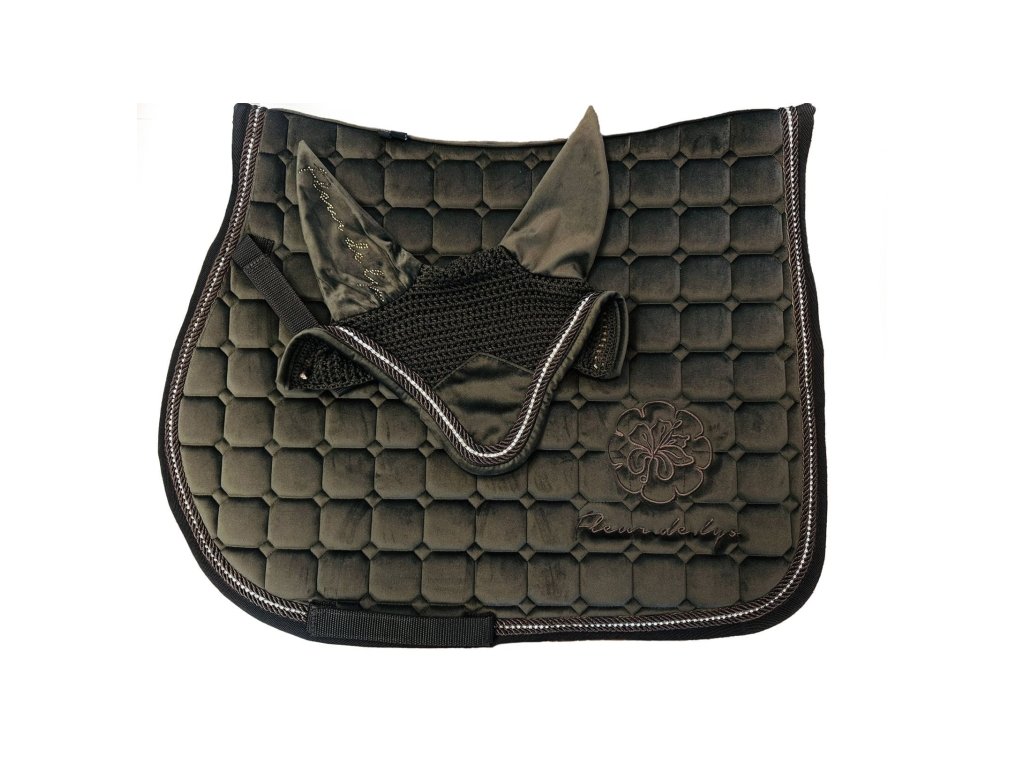 Elegantný jazdecký set z luxusnej velvet tkaniny, dokonale zladený farbou aj materiálom. Ušaňa aj skoková plstenka spolu vytvárajú harmonický a reprezentatívny komplet vhodný na tréning aj súťaže.